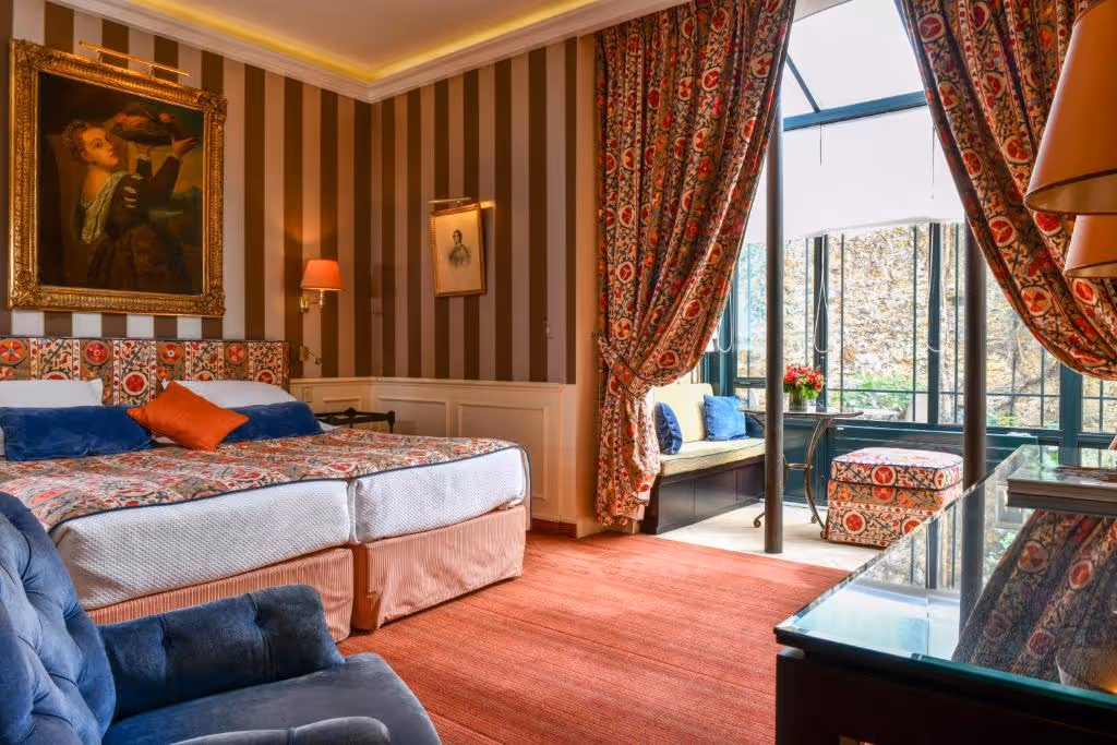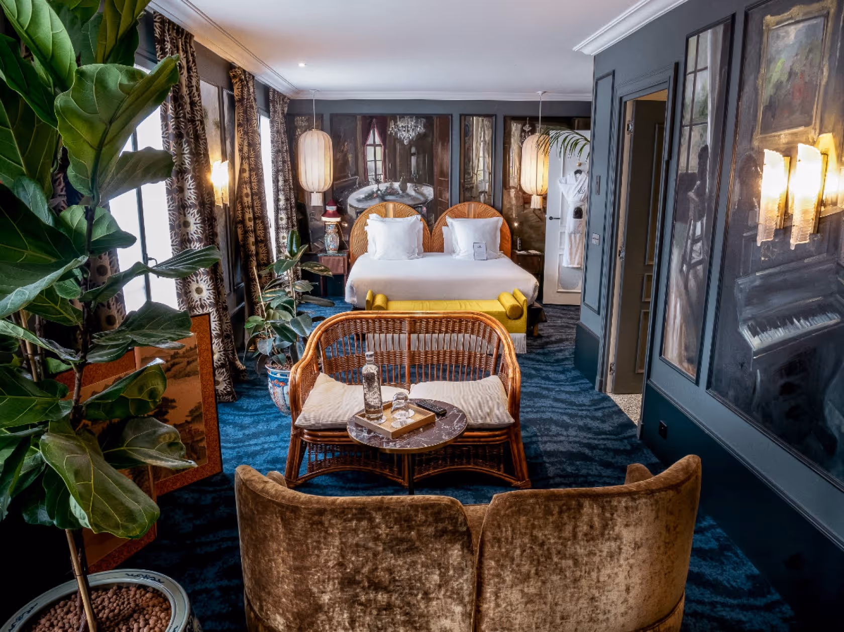 - La Chambre Deluxe : Plus spacieuse et luxueuse, elle fait la part belle aux matières nobles, aux harmonies chromatiques élaborées et aux imprimés audacieux. Ici, l’élégance se fait théâtre visuel, invitant à plonger dans un rêve parisien haut en couleur.